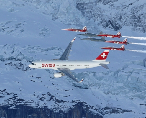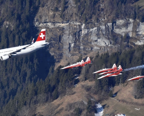 Patrouille Suisse mit Swiss-Airbus am Lauberhorn
