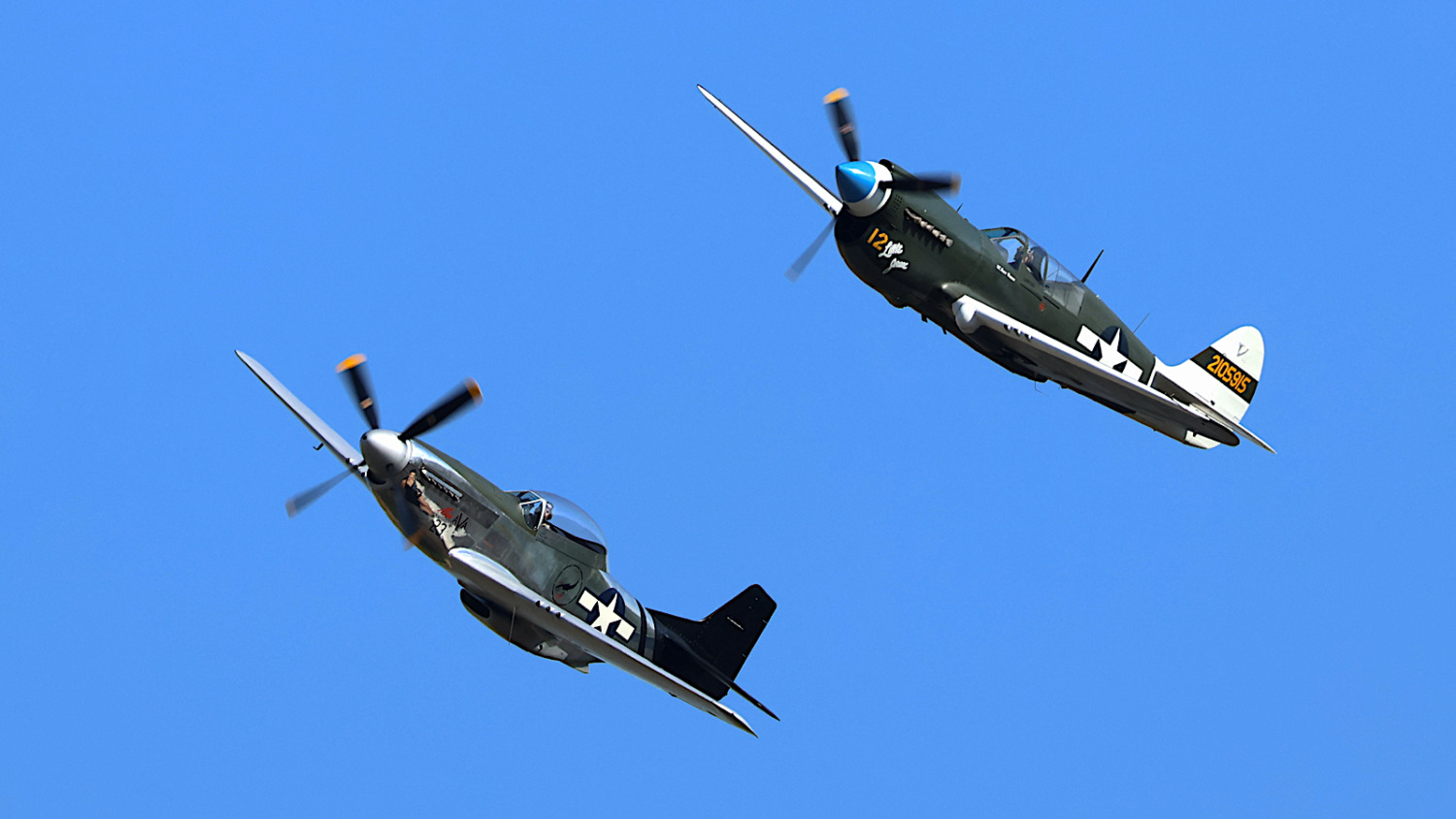 - Die bekannte Curtiss P-40N mit der neuen, TF-51D Mustang G-CLNV, welche erst ein paar Wochen bei AVA in LFA zuhause ist. Foto Christian Brechbühl