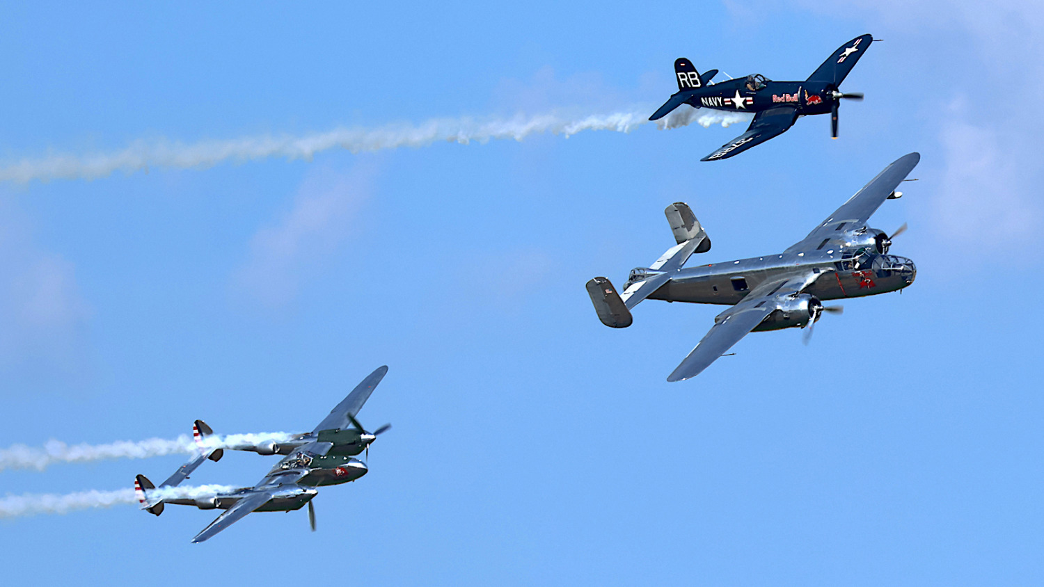 - Die drei Flying Bulls Vertreter, B-25J Mitchell P-38 Lightning und F4U Corsair boten wie immer die perfekte Vorführung. Foto Thomas Staffelbach