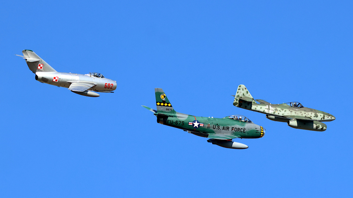 - Die Early Jets, SP-MIG Mig-15, F-AYSB F-86 Sabre und natürlich die D-IMTT Messerschmitt Me262 Schwalbe, waren trotz der vielen Rafale die Stars des Jet Anlasses. Foto Christian Brechbühl