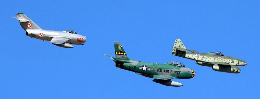 Mindestens so gewichtig war der zweite Fokus der Air Legend, nämlich den Early Jets. Nicht weniger als acht Flugzeugtypen der frühen Generation waren zu sehen: je eine Me 262 «Schwalbe» (D-IMTT), PZL Mig-15 «Fagot» und North American F-86 Sabre (F-AYSB) plus zwei Vampire (F-AZOO und F-AZHX), beide ehemals Schweizer Luftwaffe), fünf CM170 Fouga Magister, einer CM175 «Zephyr» (F-AZLT) und eine Morane-Saulnier MS.760 Paris (F-AZPF) in den Farben der französischen Marine. Zum einzigartigen Palmarès zählten auch die museale Dassault Mystère IV und die Sud Aviation Vautour vor den Safran-Werkhallen. Das Beste: Die meisten Early Jets präsentierten sich auch im Flug. Unbestrittene Stars am Himmel waren die vom Schweizer Geri «K12» Krähenbühl pilotierte Me 262, die Mig-15 und die F-86 Sabre. Das Trio als solches hat es in Wirklichkeit nie gegeben. Die Mig-15 und die F-86 hingegen begegneten sich regelmässig im Luftkampf über Korea mit unterschiedlichem Ausgang.