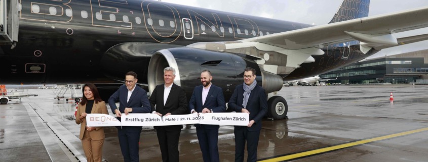 21. November 2023: Zum ersten Mal landete die neue Airline Beond am 17. November in Zürich und startete ihr neues Premium-Leisure-Angebot nach Male. Anlässlich des zweiten Besuchs stellten die Verantwortlichen am 21. November das neue Produkt vor: Mit nur 44 Plätzen startet der vorerst einzige Beond-Airbus jeweils dienstags und freitags von Zürich auf die Malediven – aber nicht nonstop, sondern via Dubai.