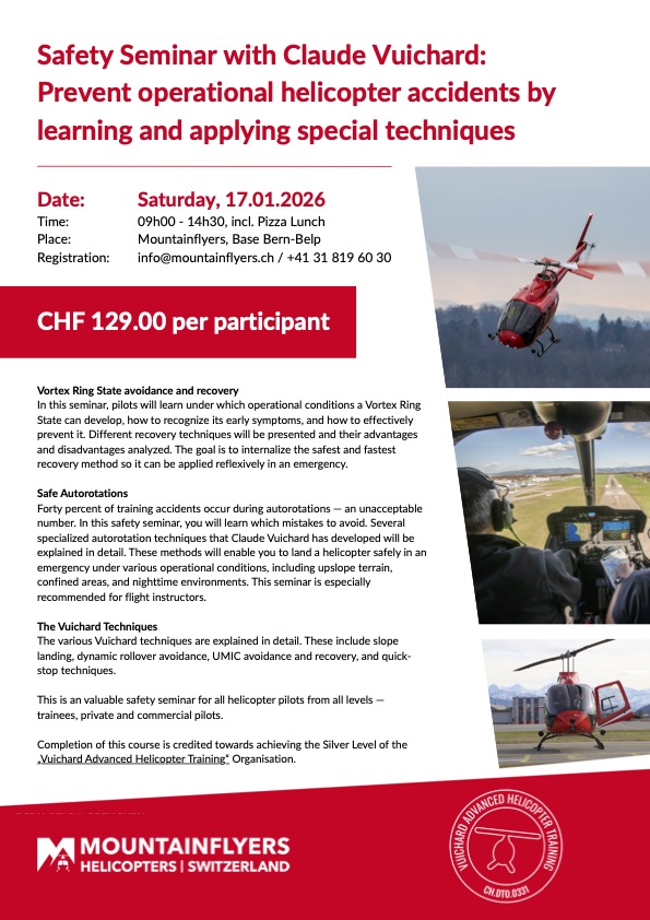10. Januar 2025: Dazulernen für mehr Sicherheit im Flugbetrieb, das bietet das Safety Seminar mit Claude Vuichard am Samstag, 17. Januar bei den Mountainflyers auf der Basis Bern-Belp. Pilotinnen und Piloten lernen in diesem Seminar, wann die Bedingungen gegeben sind, in eine gefährliche Vortex-Situation zu geraten, wie frühe Anzeichen erkannt werden und wie Vortex-Vorfälle verhindert werden. Ein weiterer Fokus des Seminars ist auf das sichere Durchführen von Autorotationstraining gerichtet.