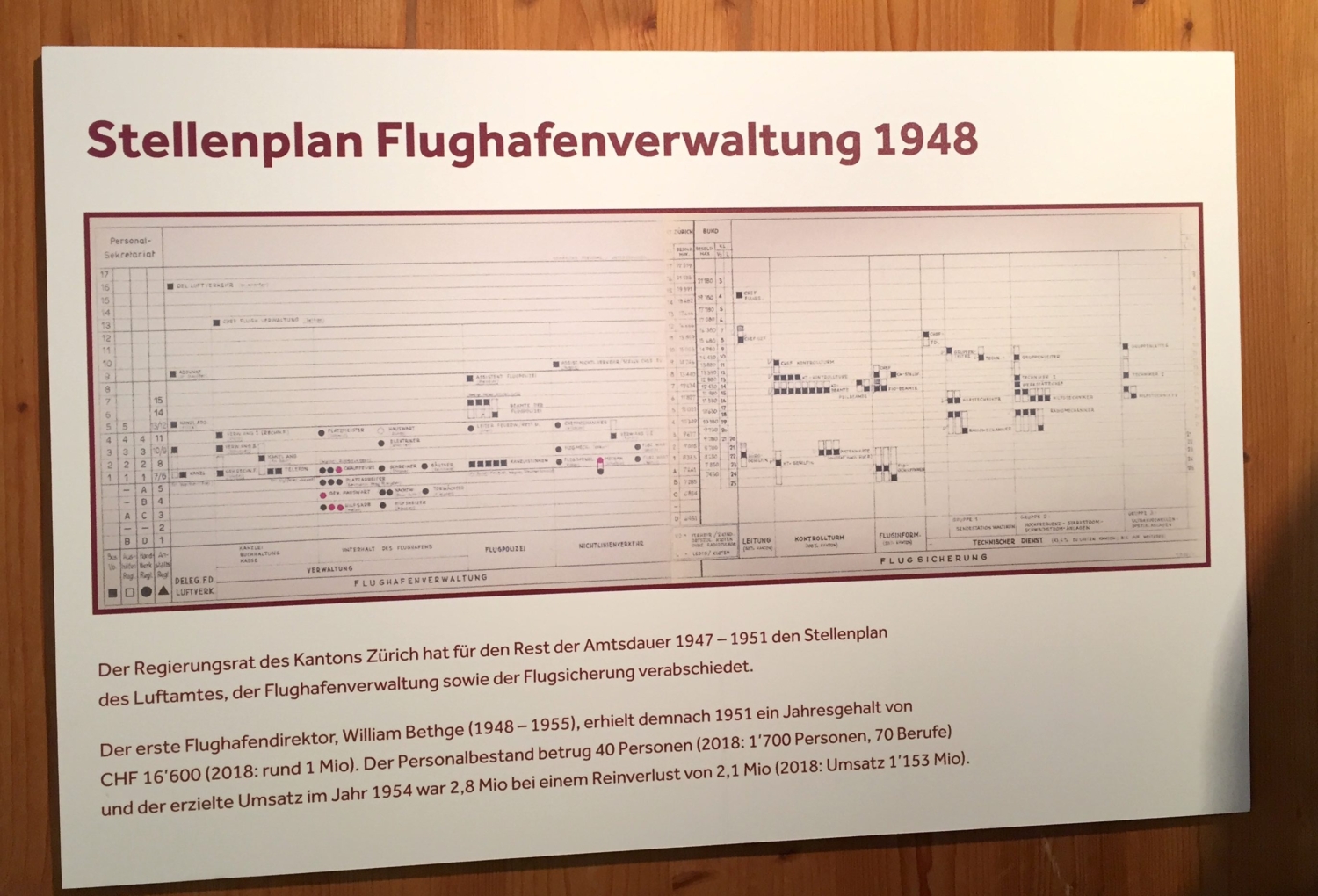 Ein weiterer Teil eröffnet historische Einblicke, etwa einen Stellen- und Lohnplan von 1948, als der Flughafen Zürich eröffnet wurde. Der Flughafendirektor erhielt beispielsweise 16’600 Franken pro Jahr – wie viel das heute wäre und wer noch mehr verdiente, zeigt die Ausstellung. Auch die Geschichte des Flughafens wird aufgerollt, von den 1940er Jahren bis heute, wobei die Besucher mitraten können, welches Grossereignis in welcher Dekade stattgefunden hat. Wie sich der Flughafen entwickelt hat, zeigen die fünf Bauetappen, welche erklärt werden.