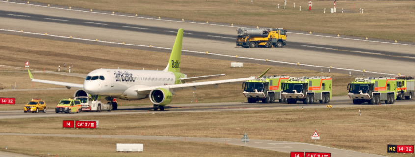 Ausgerechnet am Tag, an dem die neue Luftraumstruktur um den Flughafen Zürich eingeführt wird und Skyguide deshalb ohnehin eine Reduktion der Anflugkapazität ankündigte, sorgte die Panne mit einem Airbus A220-300 von Air Baltic, der als Flug LX2250 für Swiss nach Budapest unterwegs war, für eine weitere Erschwernis im Flugbetrieb. Die Air-Baltic-Crew landete den Airbus A220-300 YL-AAV nach dem Auftreten des Fahrwerksproblems wieder auf der Piste 14 in Zürich und blieb kurz vor dem Schnellabrollweg „Hotel 1“ auf der Piste stehen. Wie in solchen Fällen üblich, war die Flughafenfeuerwehr von Schutz und Rettung Zürich mit einem grösseren Aufgebot um das Flugzeug in Bereitschaft. Erst nach 9.30 Uhr haben die Passagiere das Flugzeug über die mobile Treppe der Feuerwehr auf der Piste 14 verlassen und wurden mit Bussen zum Terminal gefahren. Laut Swiss haben sich 117 Fluggäste und fünf Crewmitglieder an Bord des Flugzeuges befunden. Rund eine Stunde später wurde das Flugzeug von einem Schlepper unter Begleitung der Feuerwehr von der Piste gezogen. Während die Piste 14 durch das stehengebliebene Flugzeug blockiert war, wurden die Landungen auf die Piste 16 umgeleitet. Der Flugverkehr konnte damit mit Starts auf Piste 28 und teilweise Piste 16 und Landungen auf der Runway 16 mit reduzierter Kapazität weitergeführt werden. Um circa 11 Uhr konnte die Piste 14 nach Reinigung und Kontrolle wieder freigegeben werden. Eugen Bürgler