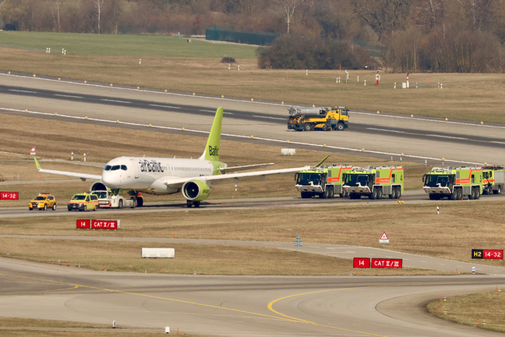 Ausgerechnet am Tag, an dem die neue Luftraumstruktur um den Flughafen Zürich eingeführt wird und Skyguide deshalb ohnehin eine Reduktion der Anflugkapazität ankündigte, sorgte die Panne mit einem Airbus A220-300 von Air Baltic, der als Flug LX2250 für Swiss nach Budapest unterwegs war, für eine weitere Erschwernis im Flugbetrieb. Die Air-Baltic-Crew landete den Airbus A220-300 YL-AAV nach dem Auftreten des Fahrwerksproblems wieder auf der Piste 14 in Zürich und blieb kurz vor dem Schnellabrollweg „Hotel 1“ auf der Piste stehen. Wie in solchen Fällen üblich, war die Flughafenfeuerwehr von Schutz und Rettung Zürich mit einem grösseren Aufgebot um das Flugzeug in Bereitschaft. Erst nach 9.30 Uhr haben die Passagiere das Flugzeug über die mobile Treppe der Feuerwehr auf der Piste 14 verlassen und wurden mit Bussen zum Terminal gefahren. Laut Swiss haben sich 117 Fluggäste und fünf Crewmitglieder an Bord des Flugzeuges befunden. Rund eine Stunde später wurde das Flugzeug von einem Schlepper unter Begleitung der Feuerwehr von der Piste gezogen. Während die Piste 14 durch das stehengebliebene Flugzeug blockiert war, wurden die Landungen auf die Piste 16 umgeleitet. Der Flugverkehr konnte damit mit Starts auf Piste 28 und teilweise Piste 16 und Landungen auf der Runway 16 mit reduzierter Kapazität weitergeführt werden. Um circa 11 Uhr konnte die Piste 14 nach Reinigung und Kontrolle wieder freigegeben werden. Eugen Bürgler
