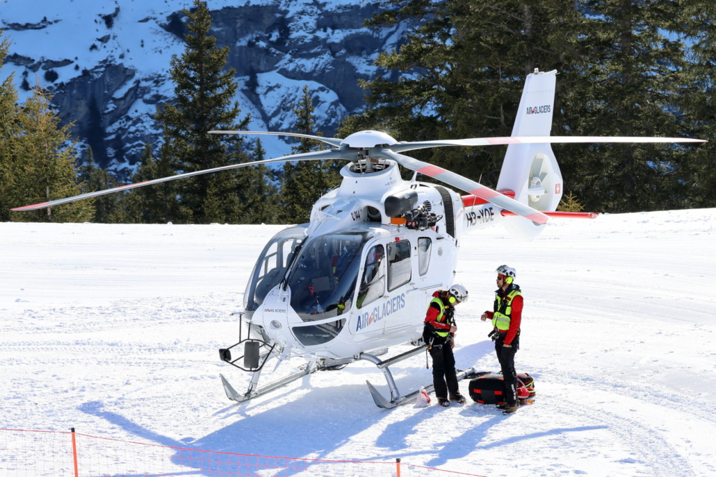 Bereits bei den heutigen Trainingsfahrten standen zwei EC135 Rettungshelikopter der Air-Glaciers auf der Wengernalp auf Pikett. Foto Eugen Bürgler
