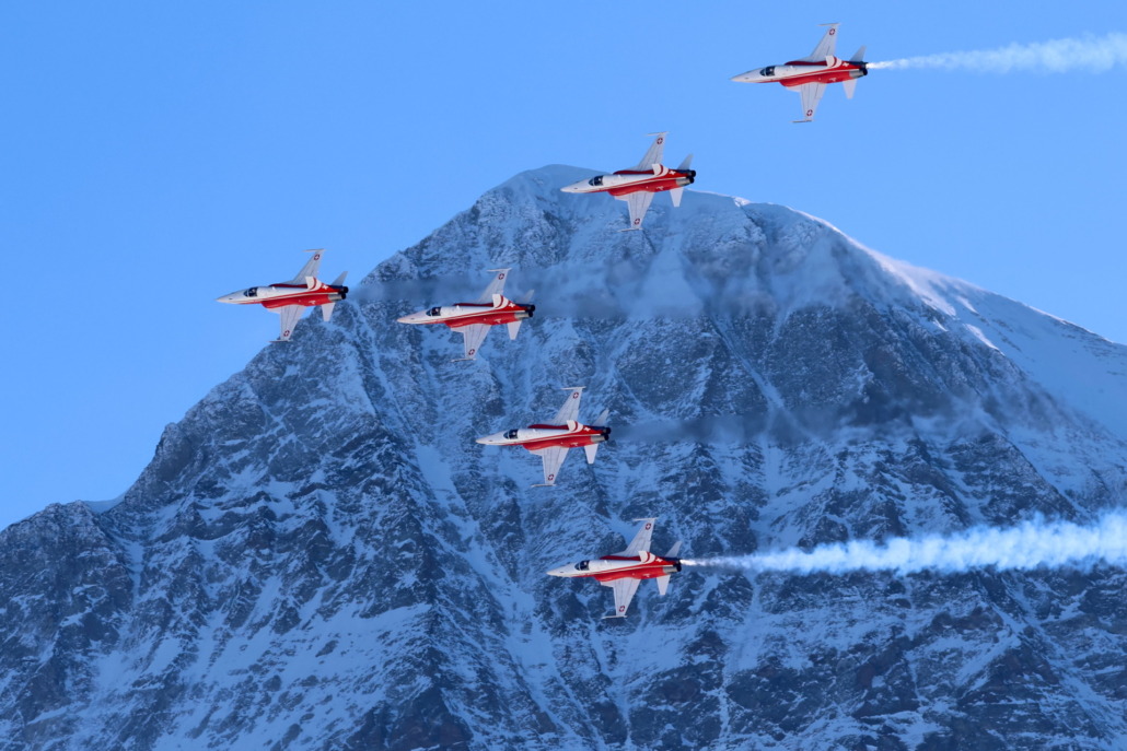 Auf Augenhöhe mit Kampfjetpiloten, dazu Gletscherlandschaft als Hintergrund, das gibts so nur auf dem Lauberhorn. Foto Eugen Bürgler