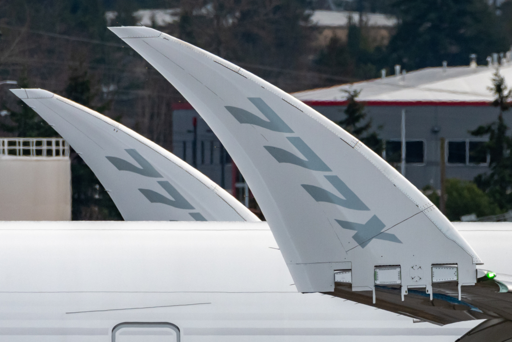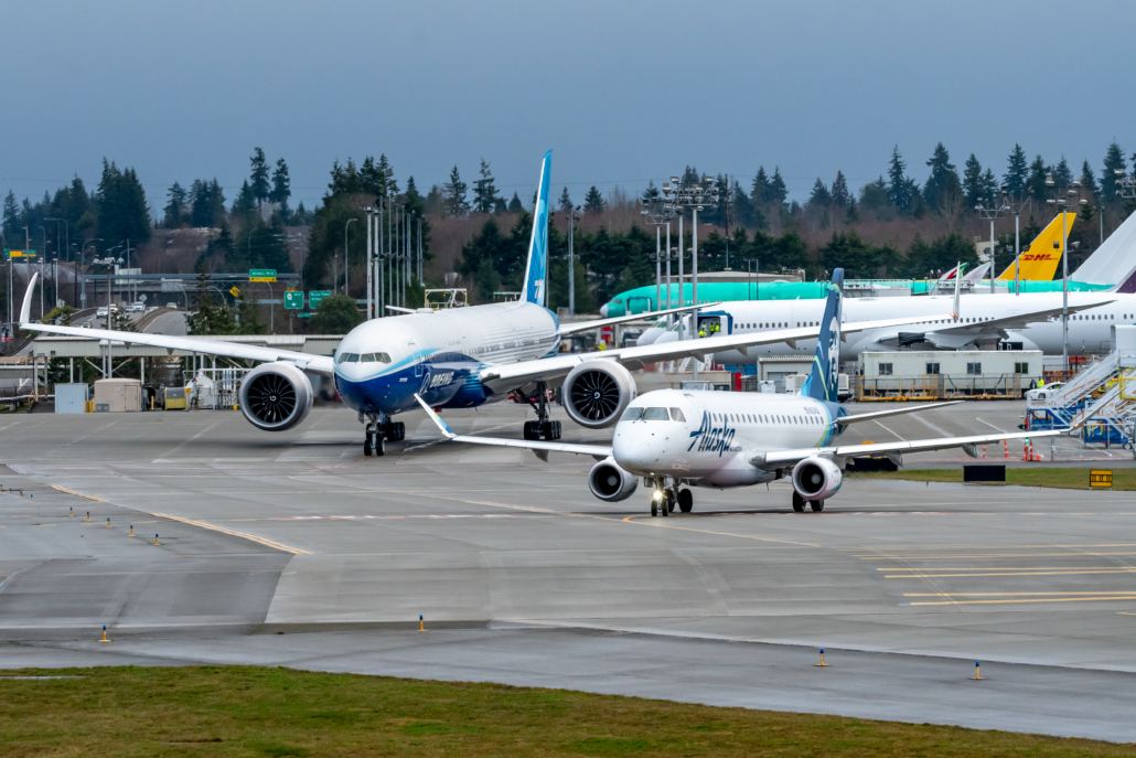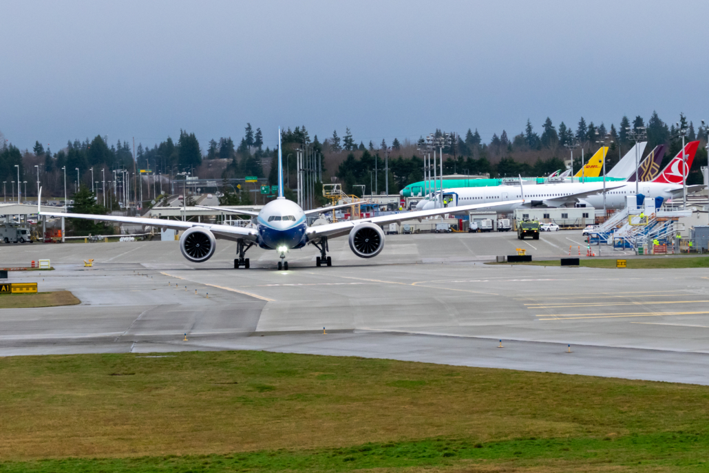 - Mit hochgeklappten Flügelspitzen rollt die erste Boeing 777-9 auf dem Paine Field in Everett. Foto Peter Schneider