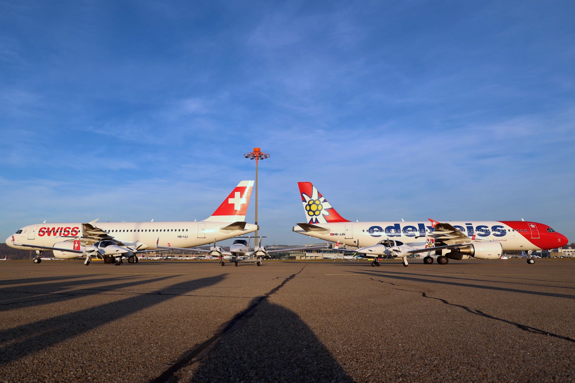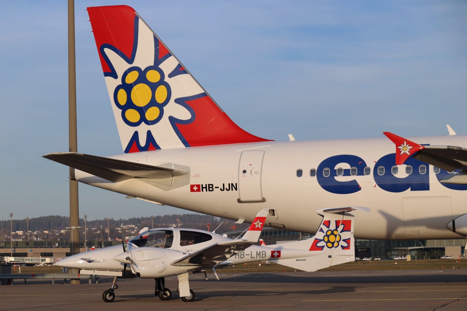 - Die neue DA42-VI HB-LMb mit dem Edelweiss-Logo vor der Edelweiss-A320 in Zürich. Foto Hansjörg Bürgi