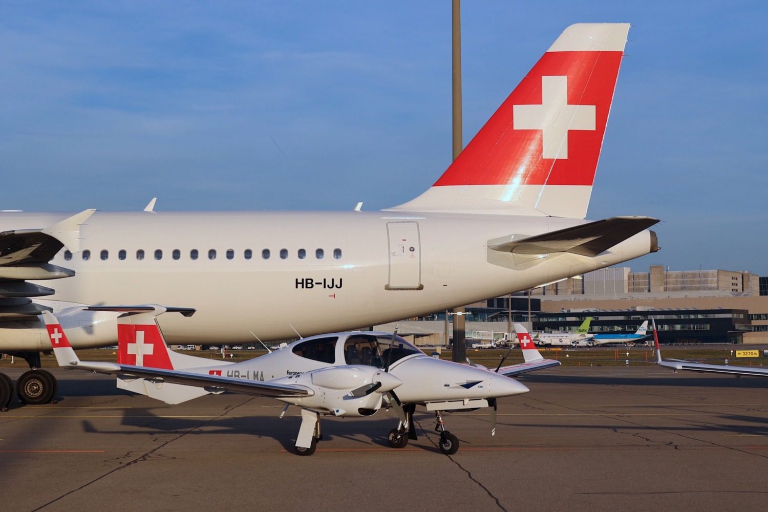 - Die neue DA42-VI HB-LMA mit dem Swiss-Logo vor der Swiss-A320 in Zürich. Foto Hansjörg Bürgi